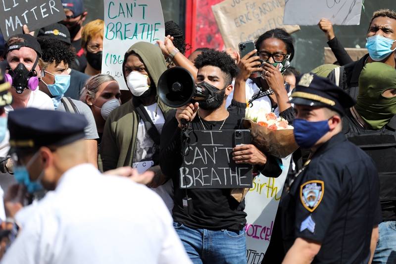 ↑2020年5月29日,在美国纽约,抗议者与警察对峙。明尼苏达州非洲裔男子乔治·弗洛伊德2020年5月遭白人警察暴力执法后窒息死亡,引发全美大规模抗议。