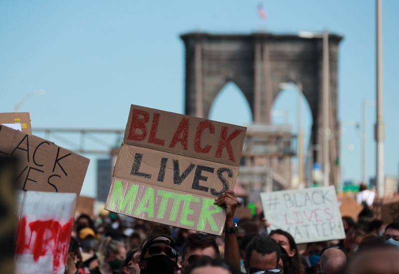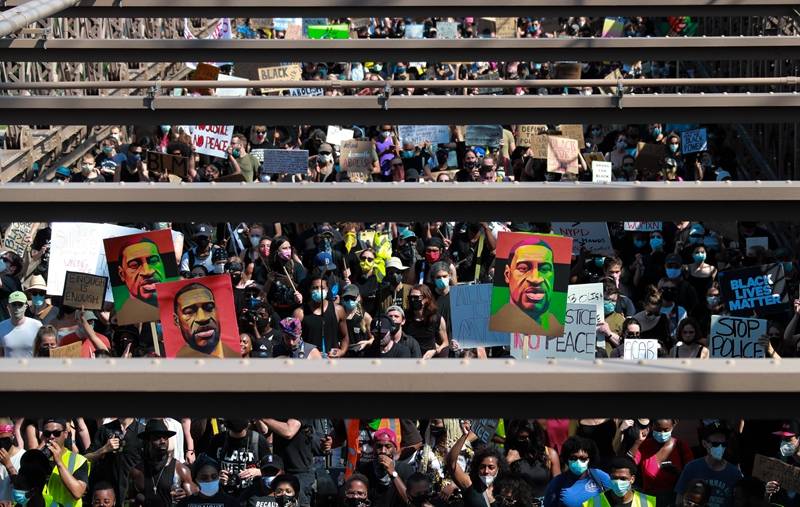 ↑2020年6月6日,抗议人群通过美国纽约布鲁克林大桥。