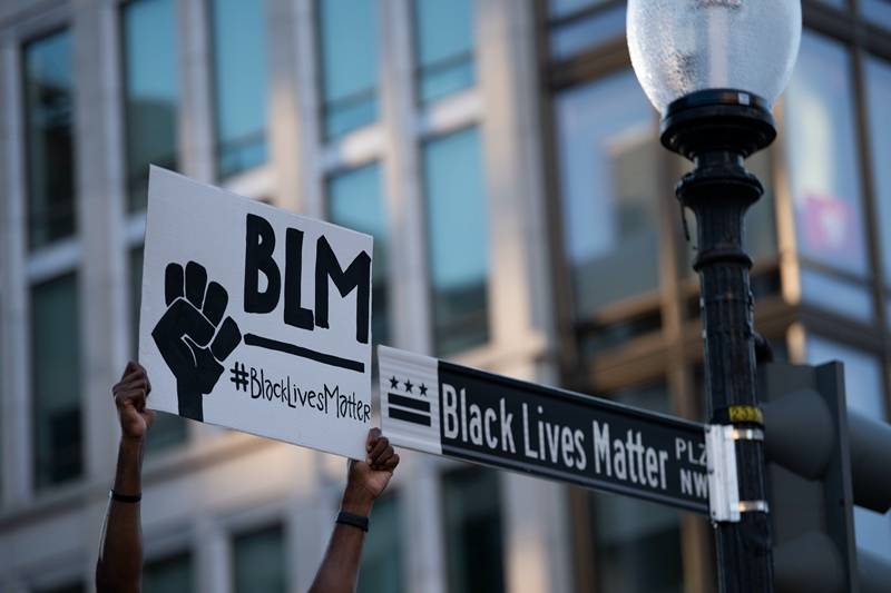 ↑2020年6月8日,一名示威者在美国华盛顿白宫附近高举“黑人的命也是命”的标语。