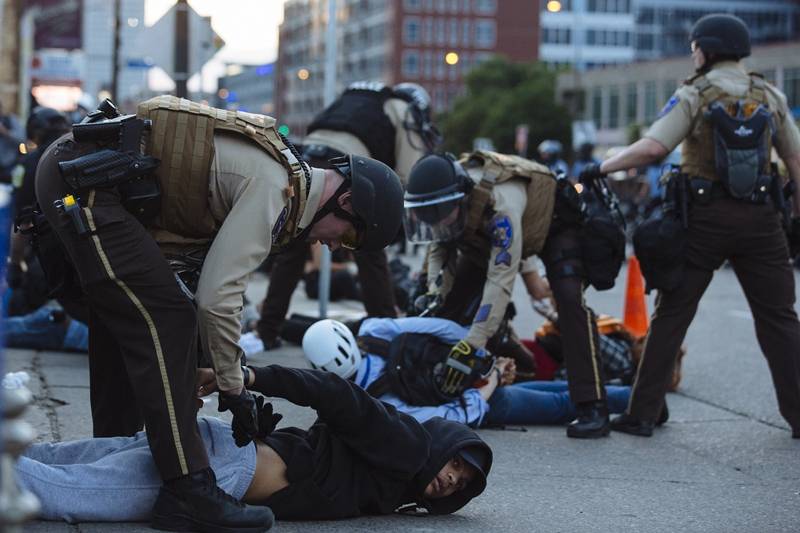 ↑2020年5月31日,抗议示威者在美国明尼苏达州明尼阿波利斯市被警察逮捕。