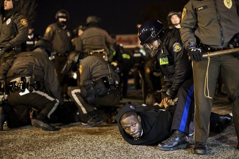 ↑2014年11月28日,在美国密苏里州弗格森警察局前,警察逮捕示威者。当晚,约100多名示威者阻断了弗格森警察局前的交通,抗议弗格森镇枪杀黑人青年迈克尔·布朗的白人警官达伦·威尔逊被免于起诉。警方随后逮捕了15名阻断交通的示威者。