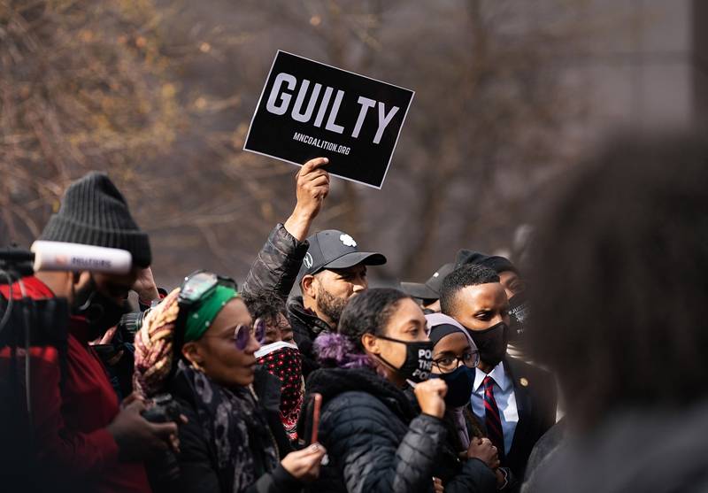 ↑2021年4月20日,得知肖万被控的谋杀和过失杀人等三项罪名全部成立后,民众手举“有罪”的标语聚集在美国明尼阿波利斯市的法庭附近。美国前白人警察德雷克·肖万被控杀害非洲裔男子乔治·弗洛伊德案20日在明尼苏达州明尼阿波利斯市宣判,肖万被控的谋杀和过失杀人等三项罪名全部成立。