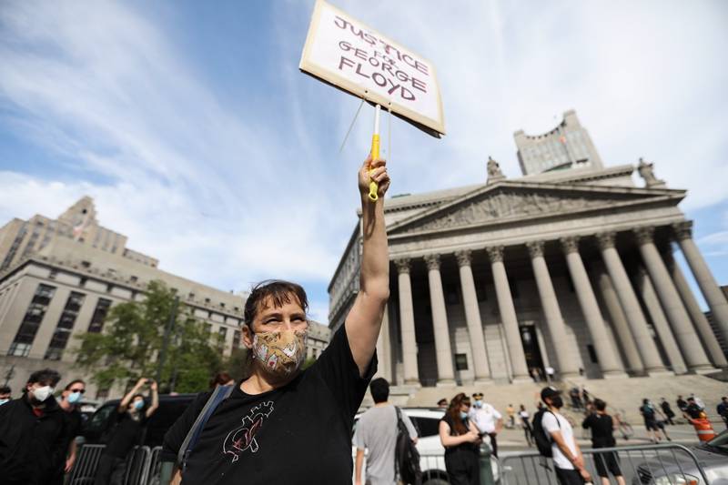 ↑2020年5月29日,在美国纽约,一名抗议者打出抗议标语。