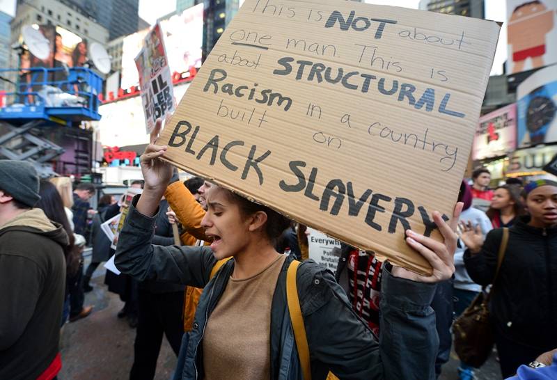 ↑2014年12月1日 ,在美国纽约,抗议者在纽约时报广场游行抗议弗格森事件。当日,数百名抗议者在纽约市参加游行和集会,抗议美国弗格森镇枪杀黑人青年迈克尔·布朗的白人警官达伦·威尔逊被免于起诉。