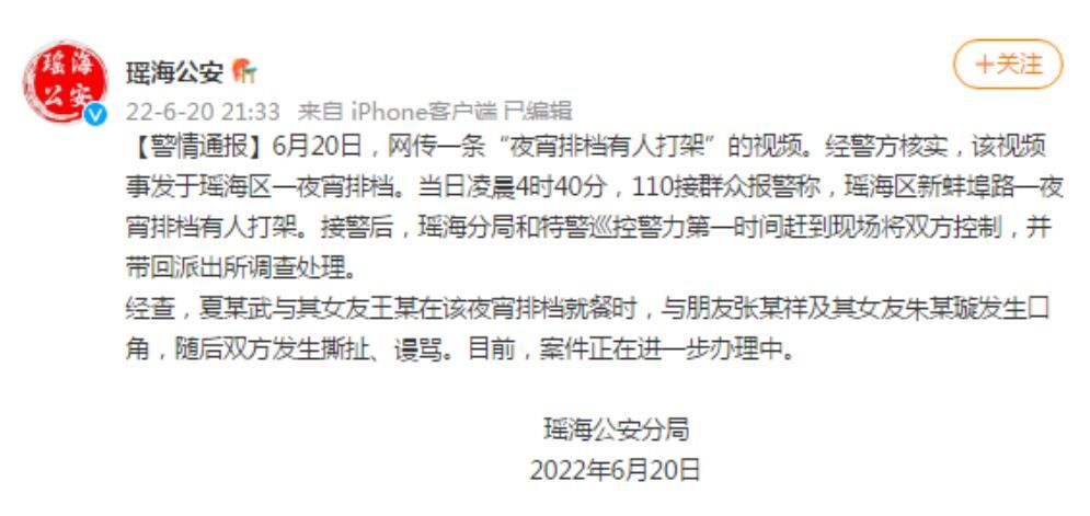 经查,夏某武与其女友王某在该夜宵排档就餐时,与朋友张某祥及其女友朱某璇发生口角,随后双方发生撕扯、谩骂。目前,案件正在进一步办理中。