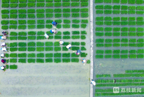 芒种过后,是一年中农事最忙的时候。连日来,在江苏(武进)水稻研究所,一派火热的农忙场景——试验田里被精细地划分成若干个小方格,工作人员整齐地排成一行,在田间进行拉线手工插秧,并在不同的方格旁插好标签,详细标识秧苗的编号,确保每份材料“对号入座”。