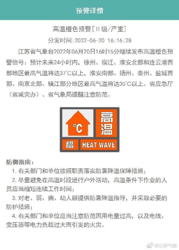 今天(6月20日),江苏省的晴好天气仍在持续,气温也是依然热辣,20日下午江苏省气象台继续发布高温橙色预警信号;不过持续高温天气即将进入尾声,根据江苏省气象台的预报,从22号夜里开始,一场自北向南的降雨将给全省带来清凉,最高气温回到30度左右,降温之日已可期。