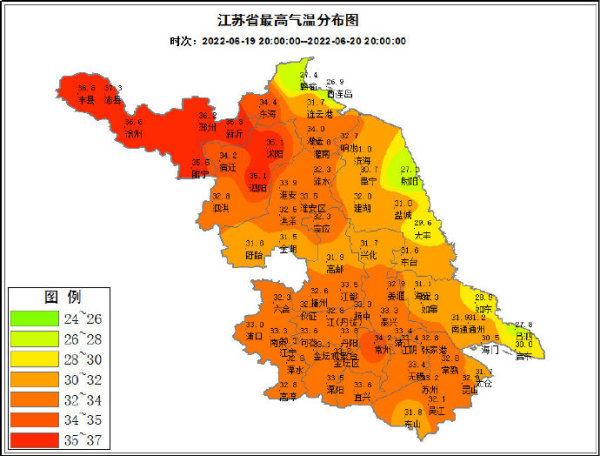 近期,雨水和高温可谓是在江苏省“极限拉扯”,6月20-21日,全省大部分以晴到多云天气为主,地面东南风为主,气温整体呈现出北高南低的趋势。苏南地区有弱降水,受局地降水影响,苏南地区和江淮之间的气温相比于前两日的已经有了一些“清凉”,最高气温回到33-35℃之间。但淮北地区由于天气晴好,气温仍持续偏高,最高气温仍然保持在35℃以上,在西北部地区还会出现37℃左右的高温,因此市民出行时还需要注意做好防暑防晒的措施,尽量避开午后等高温时段出行。