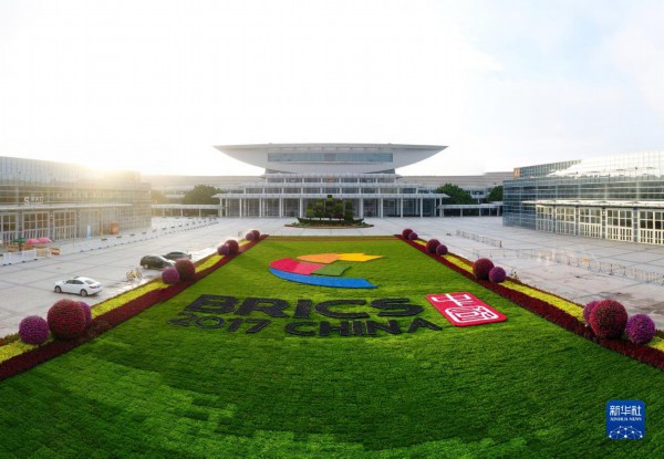 这是布置在厦门国际会展中心广场上的厦门会晤主题花坛(2017年8月24日摄)。新华社记者 姜克红 摄
