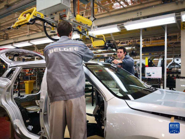 这是2018年12月1日在白俄罗斯首都明斯克东北方向50公里处的白俄罗斯吉利全散件汽车制造厂总装车间拍摄的工人组装车体。新华社记者 张若玄 摄