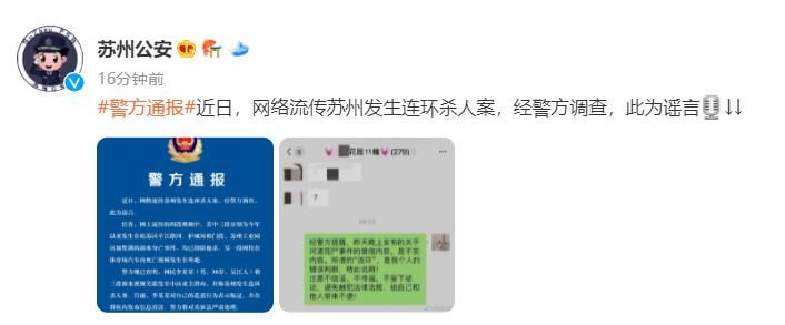 荔枝新闻讯 据苏州公安微博消息,近日,网络流传苏州发生连环杀人案,经警方调查,此为谣言。