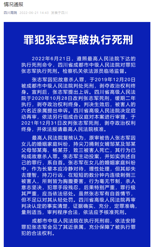 荔枝新闻讯 “四川高院”微信公众号6月21日消息,2022年6月21日,遵照最高人民法院下达的执行死刑命令,四川省成都市中级人民法院对罪犯张志军执行死刑。检察机关依法派员临场监督。
