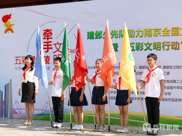 建邺区少先队员代表们用铿锵有力的声音向大家发出积极参与“五彩文明行动”的倡议,通过争做红色传承娃、黄色暖心娃、蓝色秩序娃、绿色守护娃、橙色活力娃,让文明之花处处绽放!
