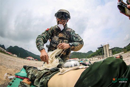 参赛队员正在对“伤口”进行包扎。董玉东 摄