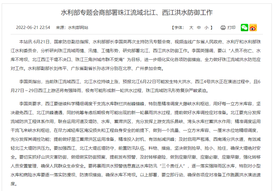 6月21日,国家防总副总指挥、水利部部长李国英再次主持防汛专题会商,视频连线广东省人民政府、水利厅和水利部珠江水利委员会,分析研判珠江流域雨情、汛情、工情形势,研究部署北江、西江洪水防御工作。李国英强调,要以“人员不伤亡、水库不垮坝、北江西江干堤不决口、珠江三角洲城市群不受淹”为目标,进一步细化实化各项防御措施,全力做好珠江流域洪水防范应对工作。水利部副部长刘伟平、广东省副省长孙志洋分别在北京、广州参加会商。