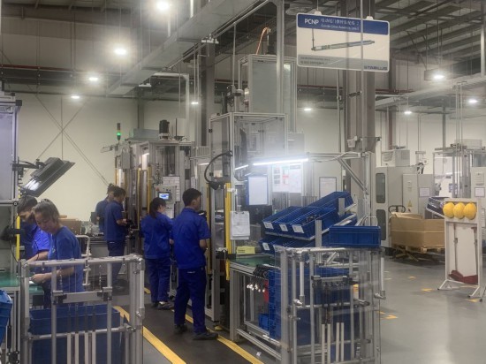 德国斯泰必鲁斯(浙江)有限公司工厂,汽车电动尾门撑杆组装线正在作业。(新华社记者 于佳欣 摄)