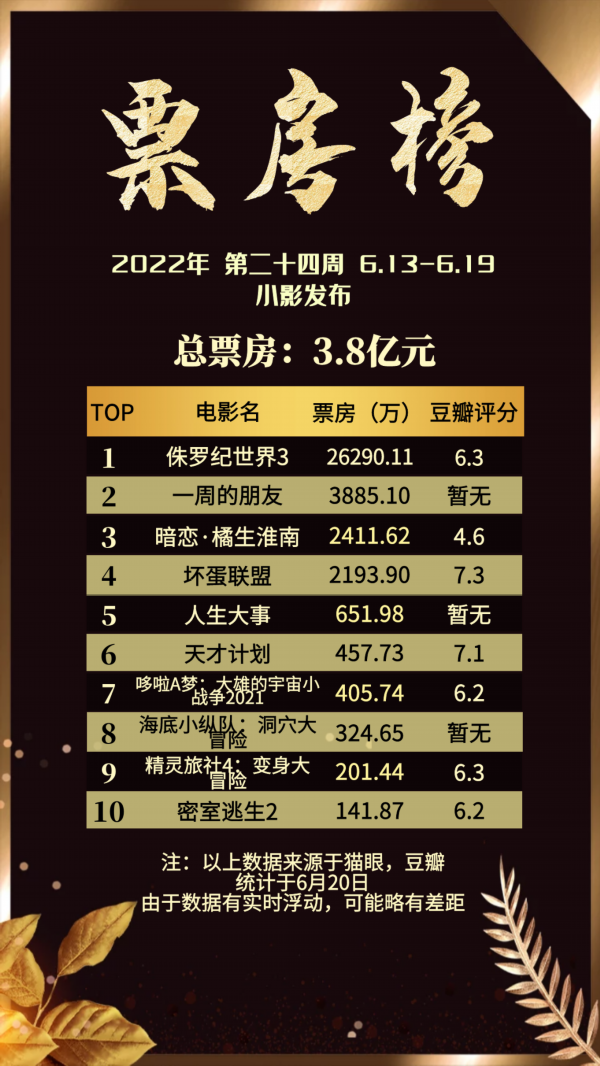 2022年第24周,周票房累计3.81亿,同比下降20%。目前影院的复工率已经平稳保持在80%以上,截至发稿前,暑期档票房11.5亿。