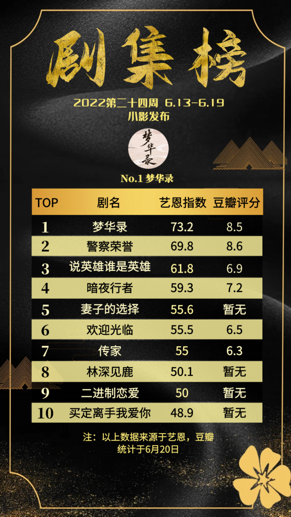 剧集市场暑期热力初显。本周电视剧《梦华录》以绝对优势登顶冠军,无论从演员、主题、剧情再到争议,都是当之无愧的热度王。《警察荣誉》《说英雄谁是英雄》《暗夜行者》前列优势明显,且横跨多个题材。