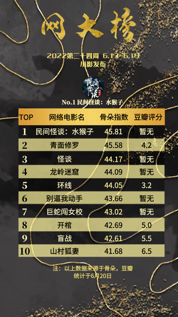 本周排在首位的是惊悚电影《民间怪谈 水猴子》,影片包含了怪兽元素,以民间传说“水猴子”为切入点,讲述了天水村村民在遭遇“水猴子”袭击时的一系列反应。从最近分账大热片《山村狐妻》,到之前五一档的《开棺》,2022开年大卖片《阴阳镇怪谈》,这些取材于东方民间传说的网络电影,巧妙糅合悬疑感、惊悚感和冒险感,不仅填补了中式惊悚题材赛道的空缺,也在市场形成了势不可挡的内容潮流。