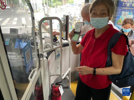 陈阿婆向公交车司机出示“离线码”后乘车 新华社记者 许东远 摄