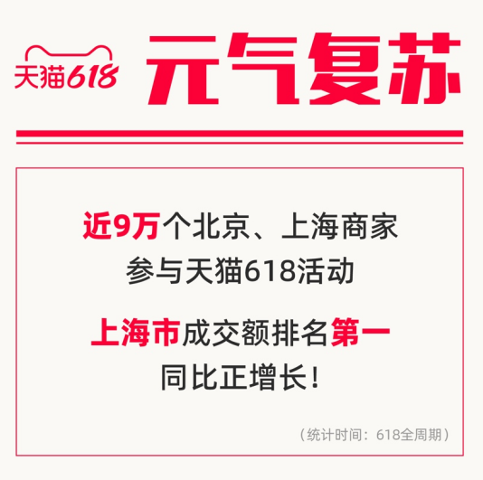 618也成为受疫情影响地区复工复产复市的重要抓手。近9万个北京、上海商家参与了天猫618活动。在全国直辖市及省会城市中,上海市的成交额排名第一,并且实现了同比正增长,北京市位居第二。