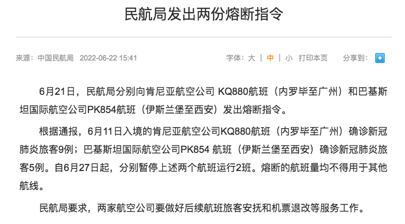 6月21日,民航局分别向肯尼亚航空公司 KQ880航班(内罗毕至广州)和巴基斯坦国际航空公司PK854航班(伊斯兰堡至西安)发出熔断指令。