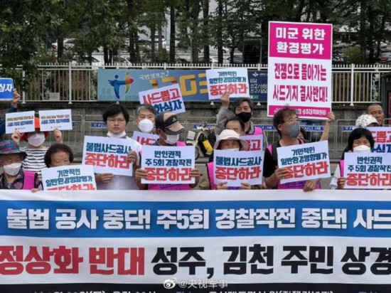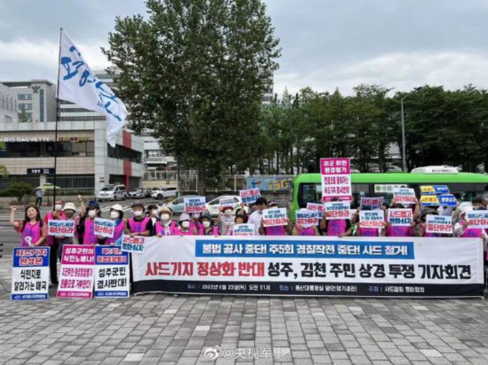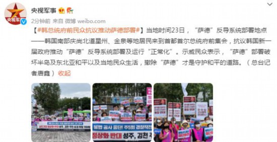 当地时间23日,“萨德”反导系统部署地点——韩国南部庆尚北道星州、金泉等地居民来到首都首尔总统府前集会,抗议韩国新一届政府推动“萨德”反导系统部署及运行“正常化”。示威民众表示,“萨德”部署破坏半岛及东北亚和平以及当地民众生活,撤除“萨德”才是守护和平的道路。(总台记者唐鑫)
