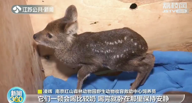 这两只小獐子的到来,也是纯属意外:“獐子有个习性,母獐子喂完奶之后会离它们稍微远一点,跟它们错开待着,它们一顿会喝很多奶,喝完就卧在那里保持安静。被市民捡到以为是走失了,给我们送过来了。”