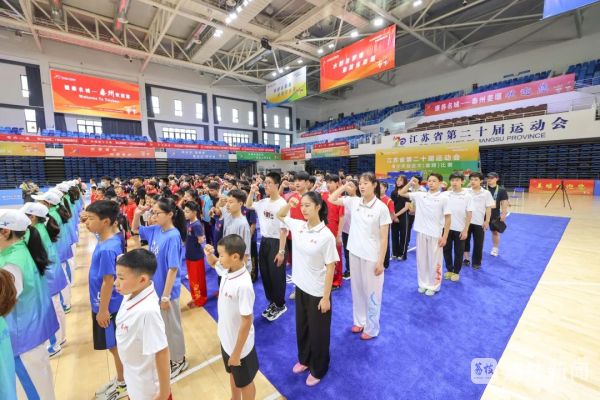 今天(6月23日)上午,江苏省第二十届运动会青少年部武术(套路)比赛开赛仪式在姜堰体育馆举行。