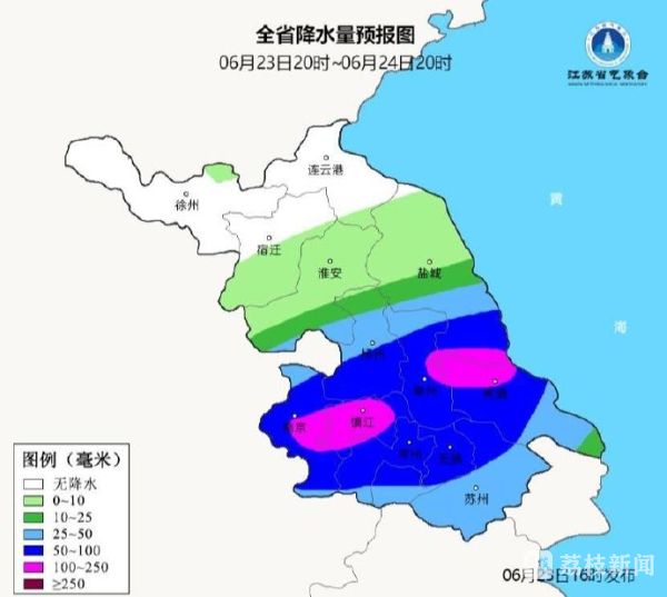 江苏省气象台首席预报员韩桂荣介绍:“从目前的情况来看,23日夜里到24日白天,江苏省依然是持续强的降水天气,因为前面的降水已经在沿淮北出现了,所以23日夜里到24日白天降水主要集中于江苏的淮河以南,特别是沿江这一线,预计降水的强度将达到暴雨,局部地区有大暴雨的天气,到24日夜里这轮降水将基本停止。”
