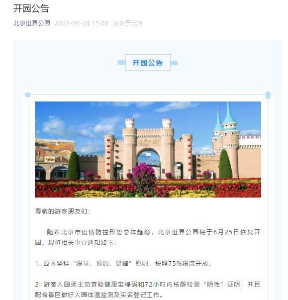 荔枝新闻讯 北京世界公园微信公众号6月24日下午发布“开园公告”。全文如下: