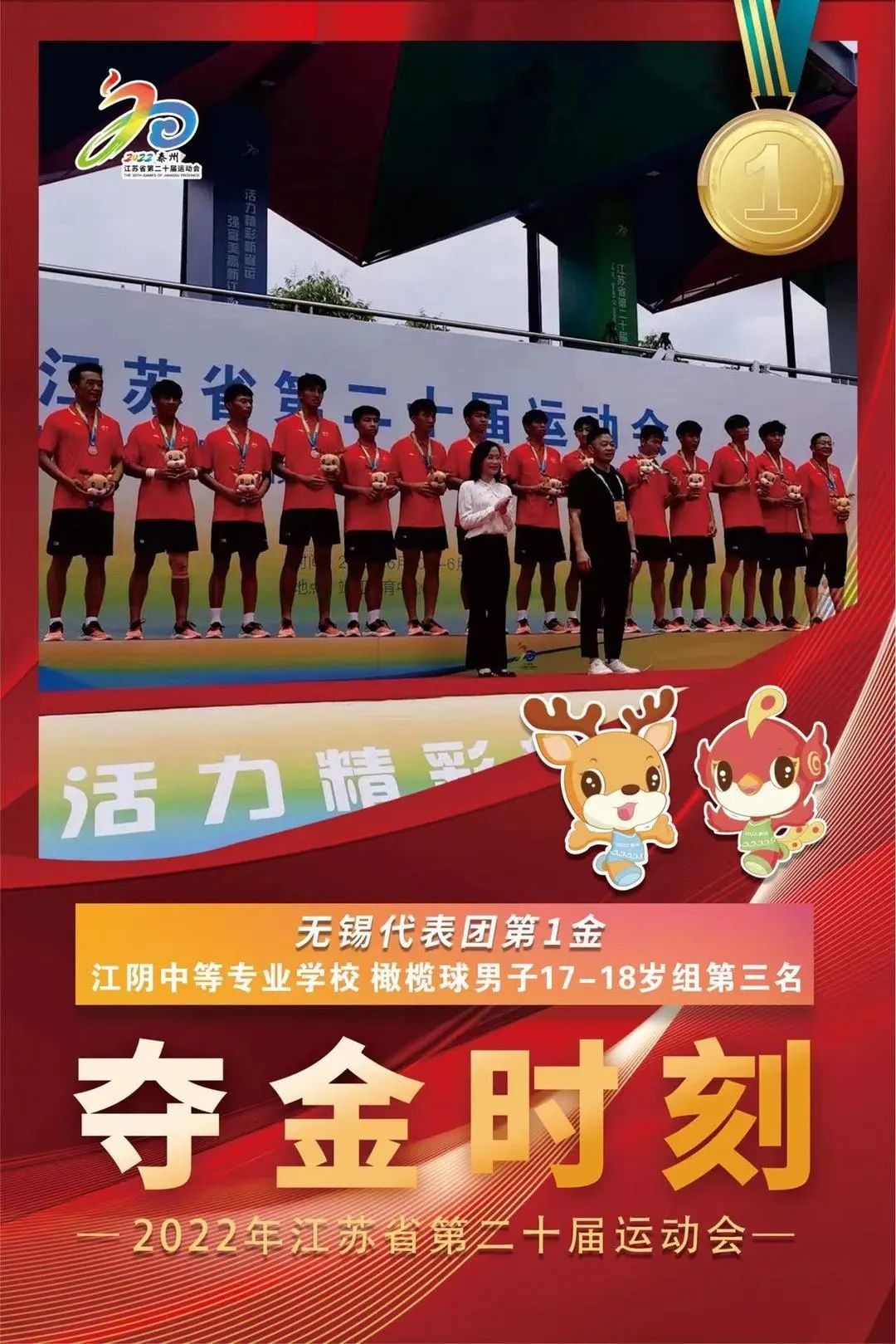 23日,江苏省第20届运动会青少年部橄榄球(17-18岁组)比赛在泰州靖江市落下帷幕,由江阴中等专业学校组队的无锡男子橄榄球队获得第三名,按省运会橄榄球比赛计分计金牌规则(冠军5枚、亚军3枚、季军2枚),无锡代表团收获两枚金牌,这是无锡在本届省运会中获得的第一和第二枚金牌。