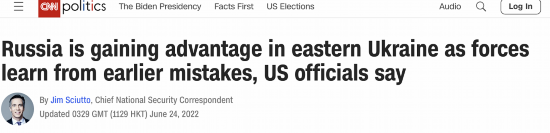 据美国有线电视新闻网(CNN)24日报道,两名熟悉美国情报评估工作的该国官员透露,俄军正在乌克兰东部获得优势。CNN还披露说,在26日至28日举行的七国集团(G7)峰会上,美国总统拜登将与其他成员国领导人共同公布对俄施压举措;在29日至30日举行的北约峰会上,美方将宣布“加强欧洲安全”的措施。