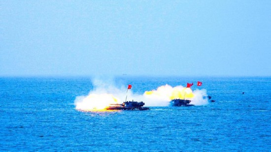 ↑两栖战车进行浮渡射击。唐瑞杰 摄