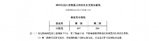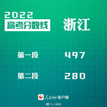 人民网北京6月25日电 (记者李依环)据浙江教育考试院消息,2022年浙江省普通高考本科各批次录取最低控制分数线划定,其中普通类第一段497分,第二段280分。