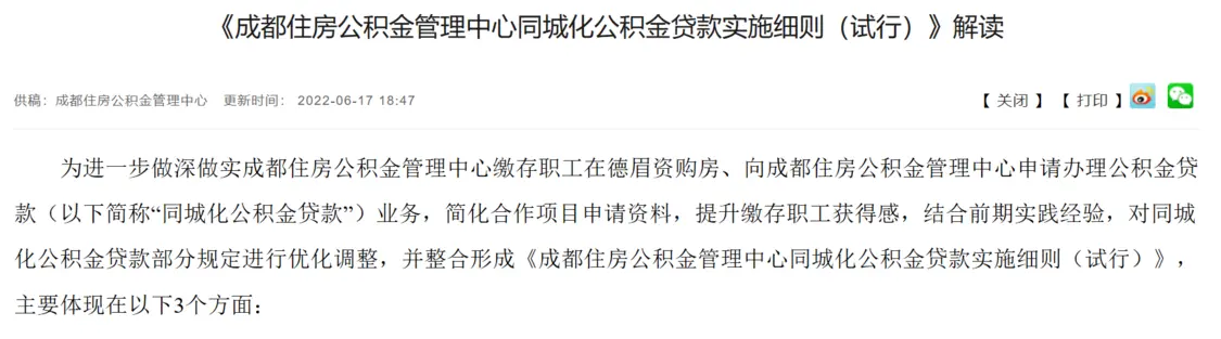 6月17日,成都住房公积金管理中心发布《成都住房公积金管理中心同城化公积金贷款实施细则(试行)》,进一步深化成都住房公积金管理中心缴存职工在德(阳)眉(山)资(阳)购房、向成都住房公积金管理中心申请办理公积金贷款业务。