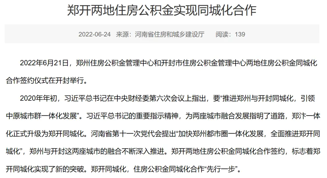 6月21日,郑州和开封两市住房公积金管理中心签署了住房公积金同城化合作协议,两地公积金实现了“信息共享、互认互贷”。