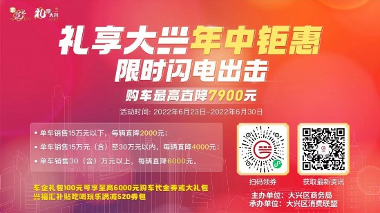 大兴再掀购车热潮!为进一步提升汽车消费对经济发展的作用,从源头激活经济,由大兴区商务局发放的汽车直降券活动于6月23日正式启动,消费者购车能享受最高7900元直降及520元商业券包。包含由大兴区商务局发放的汽车直降券,及各车企、兴福汇平台推出的代金券和商业券包活动,全面发挥汽车消费叠加效应,缓解商家经营压力,为消费者送上实实在在的购车福利。据悉,本次活动共历时8天,截至6月30日结束。