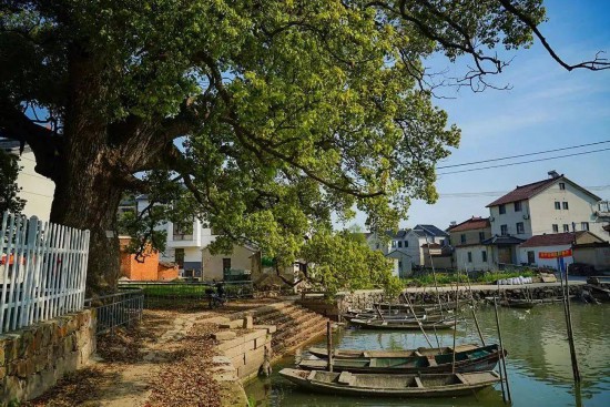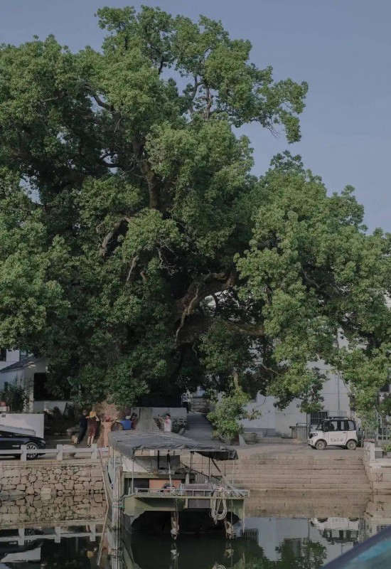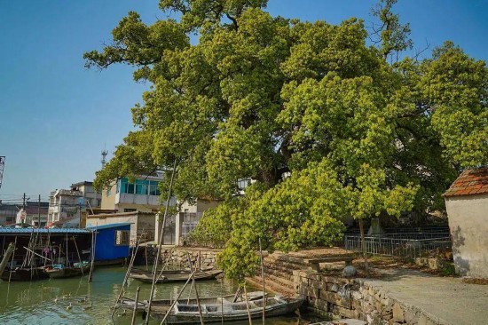 阴山岛有一条长长的大堤村口,有一株千年参天古樟。它植于东吴孙皓天纪四年,距今已有近1800年历史,远看过去几乎将小岛严实地纳入它的怀抱之中。