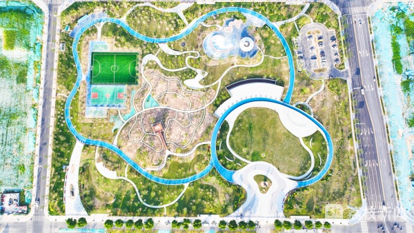 公园以“书香”为主题,以水波曲线造型的夜光跑道环作为主游线,打造兼顾户外休闲、文化展示、体育运动、亲子游乐、科普教育的多功能趣味性社区公园。