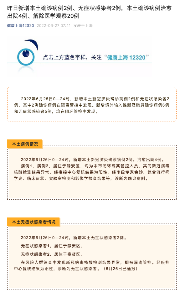 荔枝新闻讯 据“健康上海12320”微信公众号消息,2022年6月26日0—24时,新增本土新冠肺炎确诊病例2例和无症状感染者2例,其中2例确诊病例在隔离管控中发现。新增境外输入性新冠肺炎确诊病例6例和无症状感染者5例,均在闭环管控中发现。