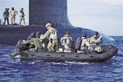 在“环太平洋”演习中,多国参演人员登上小艇(资料图)。