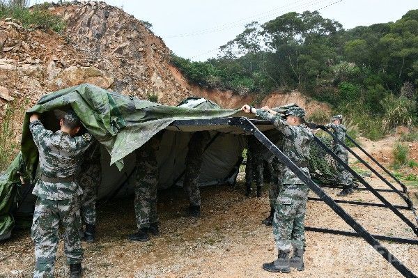 野外驻训不是简单的换场训练,更不是野外生存体验生活。进驻后,该旅统一化模式,按照实战要求、区分专业要素迅速分散部署展开,一顶顶帐篷、一个个货场在官兵齐心协力下逐一搭设完成。