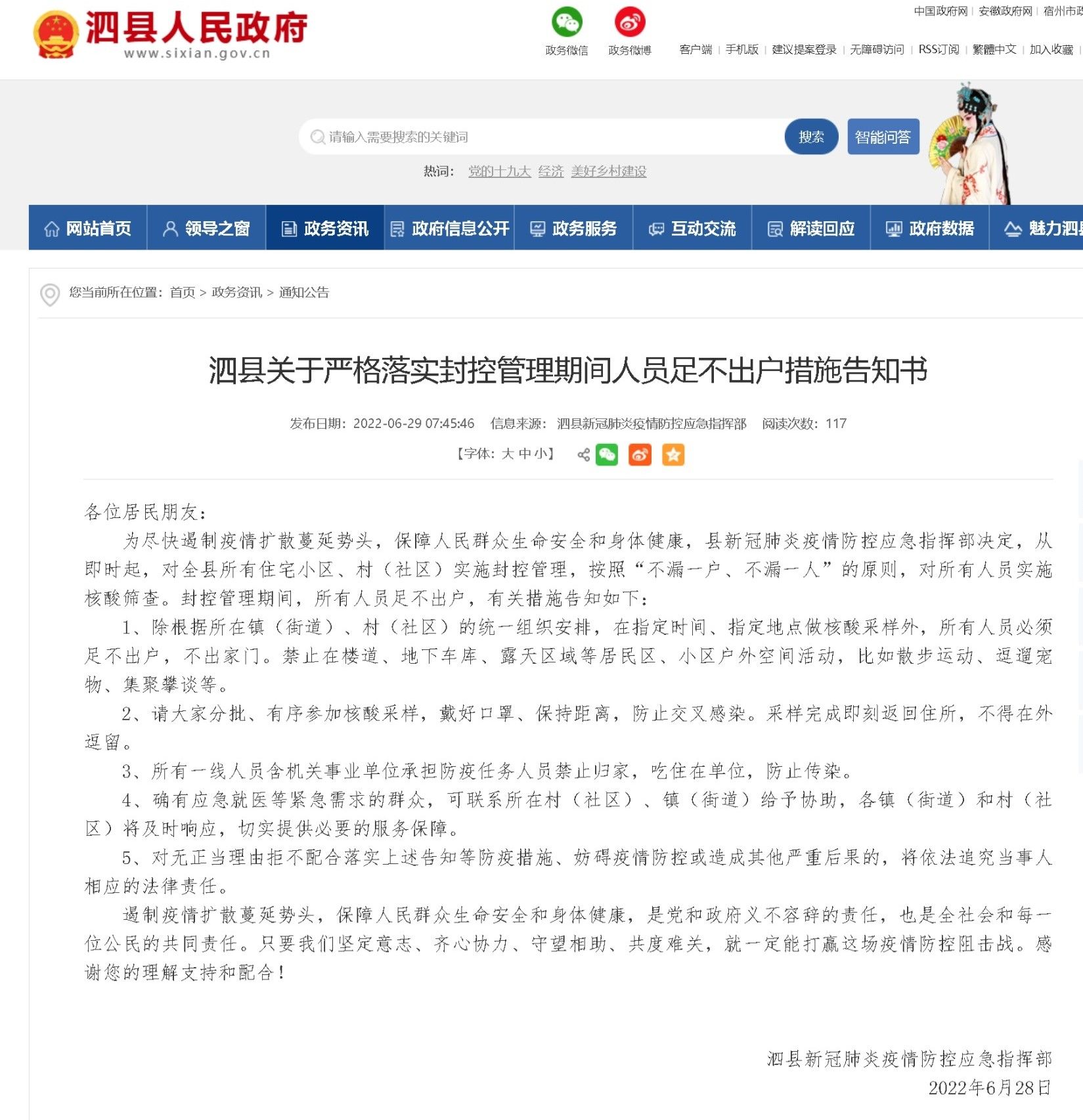 泗县关于严格落实封控管理期间人员足不出户措施告知书