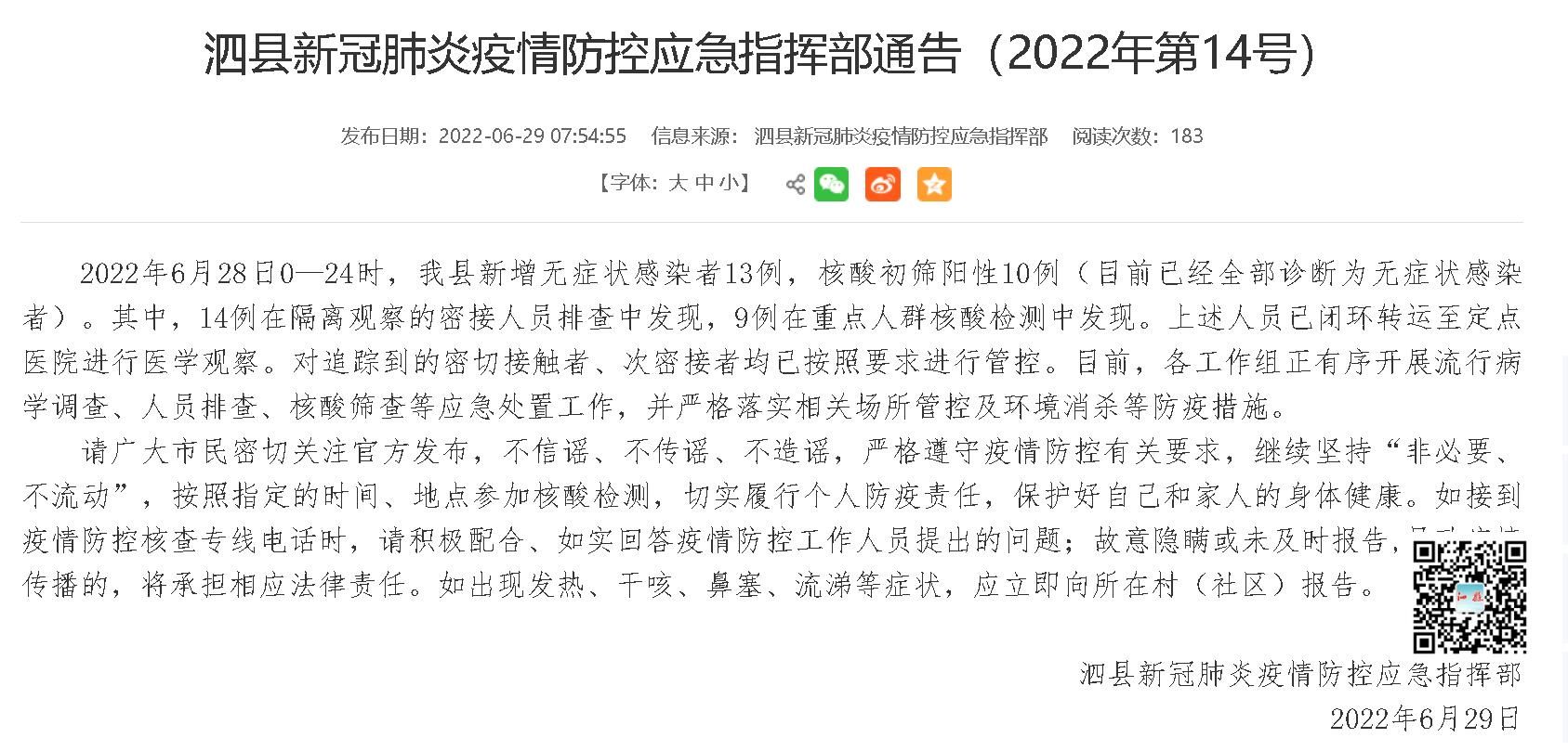 荔枝新闻讯 安徽泗县新冠肺炎疫情防控应急指挥部发布通告,2022年6月28日0—24时,泗县新增无症状感染者13例,核酸初筛阳性10例(目前已经全部诊断为无症状感染者)。