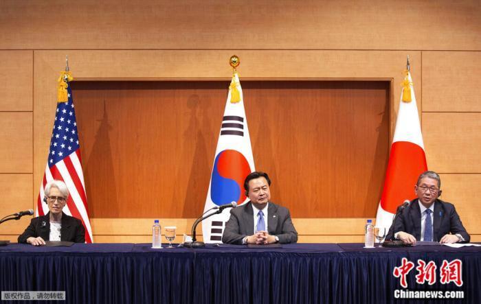 资料图:6月8日,美国副国务卿谢尔曼、韩国外交部第一次官(副部长)赵贤东和日本外务省事务次官森健良在韩国首尔举行联合记者会。