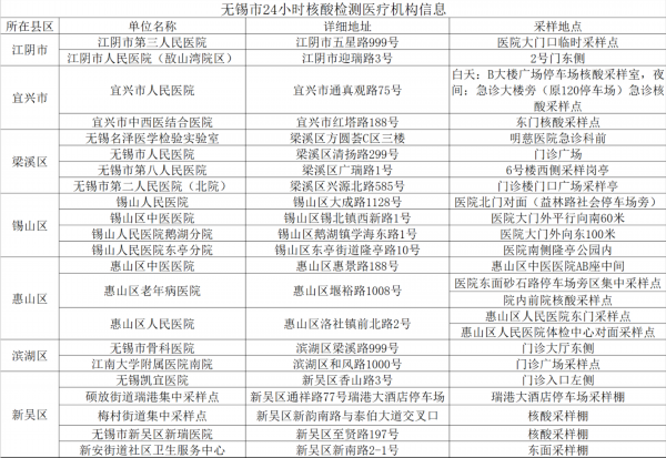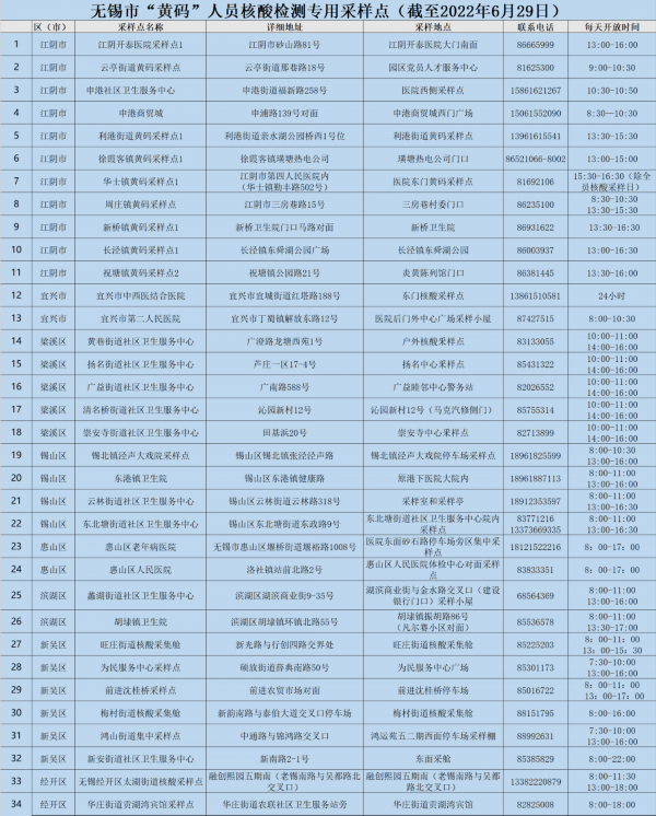附:无锡市“黄码”人员核酸检测专用采样点(截至2022年6月29日)
