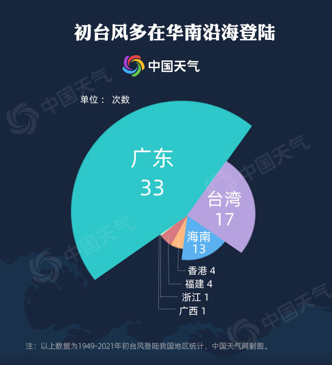 根据中国天气网统计,在过去73年中,有33年初台风登陆广东、17年登陆台湾、13年登陆海南,分别占到总数的45%、23%、17%。此外,香港、福建、浙江、广西也均有初台风登陆。