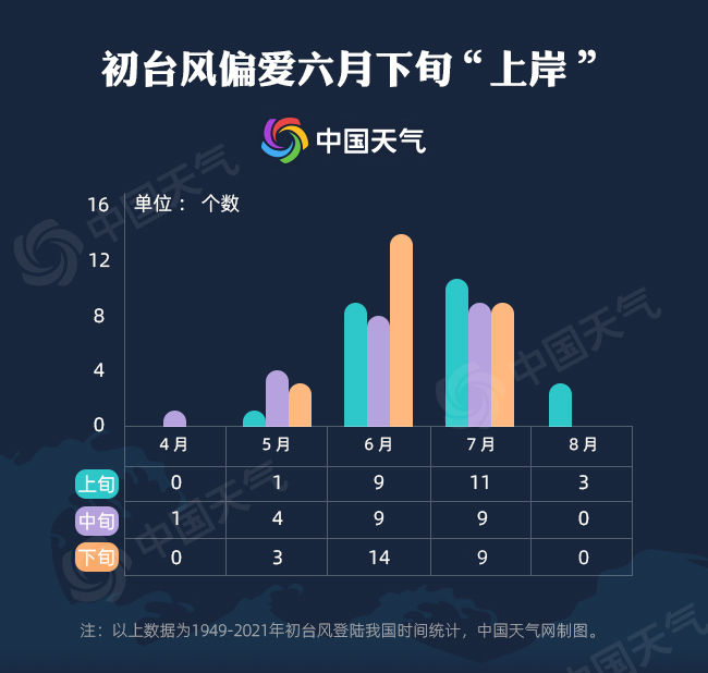 中国天气网大数据显示,首个登陆我国的台风多集中在6至7月份,这两月初台风登陆我国的比例高达83%,其中,在6月下旬登陆的比例最高,达14次,7月上旬位列第二,达11次。