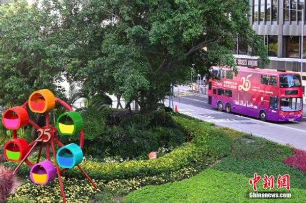 6月23日,随着香港回归祖国25周年纪念日临近,香港上环及中环随处可见庆祝香港回归祖国25周年的横幅、海报等,喜庆气氛浓。图为一辆庆回归主题巴士经过中环街头。 中新社记者 李志华 摄